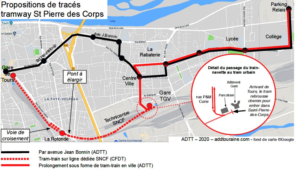 Le tracé en noir reprend le projet de tramway de la gare de Tours à Saint-Pierre-des-Corps via l’Avenue Jean Bonnin ; il dessert le centre-ville de Saint-Pierre, la Rabaterie et la zone scolaire à l’Est mais non la gare TGV.