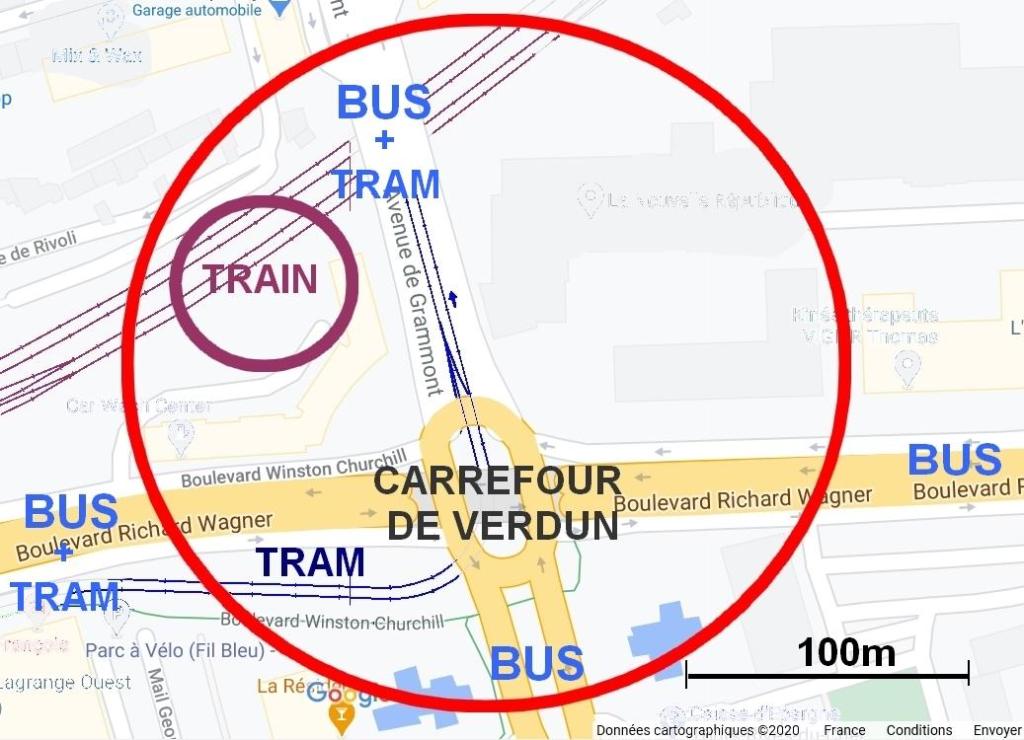 Déjà sous la mandature de Jean Germain, un pôle de connexion entre tramway et réseau ferroviaire avait été envisagé sur le pont de l’Avenue de Grammont, proche du Carrefour de Verdun, franchissant les voies ferrées. Ce projet n’a guère avancé. Il est pourtant riche de possibilités. Une nouvelle station de tram reliée à un ascenseur donnerait accès à une gare en contrebas où passent des TER venant du Nord, de l’Ouest et de l’Est de la Métropole. Par correspondance, on pourrait ainsi joindre Saint-Pierre des Corps aussi bien que Mettray, ND d‘Oé, Savonnières, Montlouis ou Véretz. On éviterait une rupture de charge en gare de Tours, laquelle pourrait être soulagée d’une partie de son trafic.