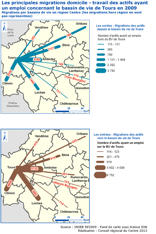 Le trajet de seulement 47 km demande de bout en bout 62 minutes, alors qu’en 1995 il se faisait en 58 minutes. L’offre est très loin d’être satisfaisante avec seulement 34 trains de voyageurs qui circulent par semaine. Les dysfonctionnements (retards, suppressions de trains) sont récurrents. Or la ligne dessert 2 gares de la métropole tourangelle (Joué & La Douzillère), 3 dans la première couronne (Montbazon, Veigné et Esvres) et, après Cormery, 2 gares éloignées des bourgs (Courcay-Tauxigny et Reignac), enfin les 2 dernières gares Chambourg et Loches. Tout le long de la ligne, on dénombre 36 500 habitants. La gare de Cormery est implantée à proximité immédiate du Node Park qui totalise 1 600 emplois. Les 2 cartes ci-dessous, issues du blog Transportrail, montrent bien les besoins en déplacements domicile-travail que la ligne pourrait faciliter.