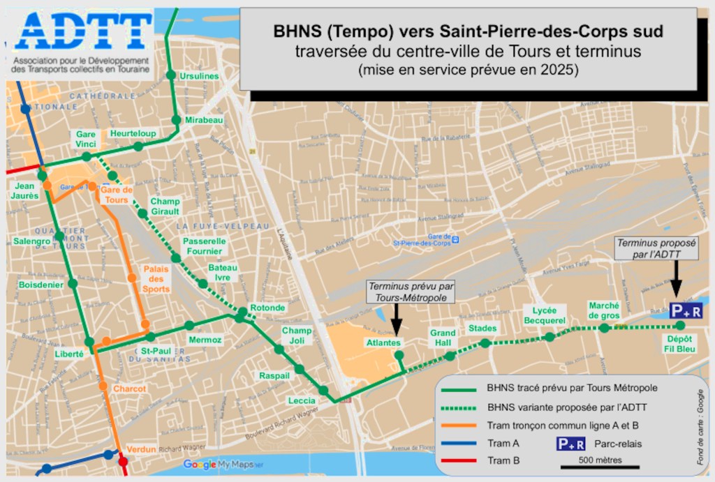 De plus, le terminus annoncé aux Atlantes est bien peu amnitieux, et c’est à se demander pourquoi le sort s’acharne sur la commune de Saint-Pierre-des-Corps pour les questions de mobilité. La vie continue à l’est des Atlantes où l’on trouve de nombreux commerces et entreprises dans la zone des Grands Mortiers, et au nord de l’avenue Jacques Duclos (commune de Tours), un lycée (les lycéens sont les premiers usagers des transports collectifs urbains), un collège, de nombreux terrains de sport utilisés par les jeunes, le marché de gros, jusqu’au siège de Fil Bleu, où travaillent chaque jour quelques 600 salariés.