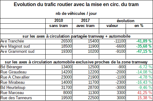 Dans les rues partagées par le tramway et l’automobile, le trafic a fortement baissé, jusqu’à être presque divisé par deux sur le sud de l’avenue Grammont (entre Liberté et Verdun). Si cette conséquence est une évidence, il est encore plus intéressant de constater que c’est pratiquement dans tout le grand centre de Tours (entre la Loire et le Cher) que la circulation a baissé, à l’exception notable des rues des Tanneurs et Marceau, ce qui permet de déduire que le tramway a eu un effet positif de baisse générale de la circulation vers ou au départ du centre-ville. C’est en réalité sur les axes de contournement que le trafic a sensiblement augmenté entre 2010 et 2017 : l’avenue du Danemark, l’A10 nord, et le boulevard périphérique, en précisant toutefois que le tronçon nord-ouest du périphérique n’était pas en service en 2010. « Bien que le nombre global de déplacements ait augmenté, le nombre de déplacements en voiture a diminué, passant de 600.000 à 580.000 déplacements quotidiens. (…) malgré une augmentation de la distance moyenne d’un déplacement, passée de 3,4 à 3,5 km, la distance cumulée en voiture, et donc le nombre de kilomètres réalisés en voiture, a diminué de 1,87 en 2008 à 1,77 Mkms en 2019 »3(100.000 kms en moins soit 5 %).