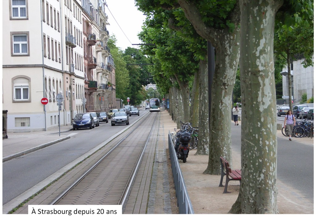 Pour l’exemple emblématique de l’axe Béranger, il n’y a pas à choisir entre les arbres ou le tramway, car nous avons besoin des deux. Le tramway sera facteur d’embellissement du boulevard et du mail, et redonnera une nouvelle jeunesse aux marchés qui s’y trouvent. A l’image des villes de Strasbourg ou Bordeaux (photos ci-dessous), dont le tramway emprunte des boulevards ayant un mail arboré, mais aussi à l’image des rues empruntées par la ligne A à Tours et Joué, le patrimoine bâti y sera mieux mis en valeur, tout comme le patrimoine végétal qui pourra même y gagner plus d’espace. Il est donc probable qu’il faille abattre quelques arbres, mais il est possible d’en (re) planter. Le bilan de la ligne A est le suivant : 1085 arbres supprimés / 66 arbres transplantés / 2303 arbres plantés. Pour la 2e ligne, à ce stade du projet il est prévu de supprimer 627 arbres, et d’en planter 1884 (données SMT).