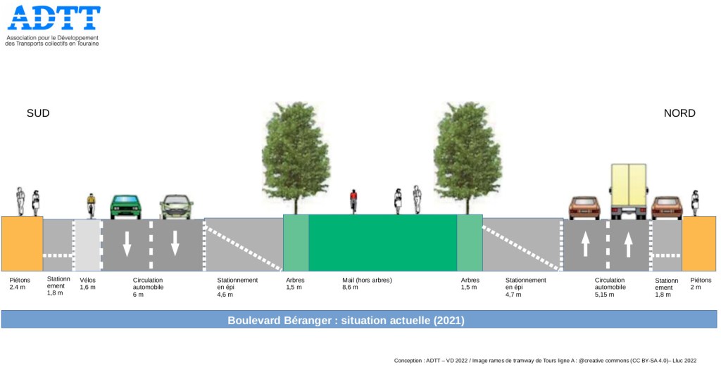 On connaît deux scénarios pour l’intégration du tramway sur le boulevard Béranger : les deux voies au nord du mail pour le premier, ou une voie de chaque côté pour le second.