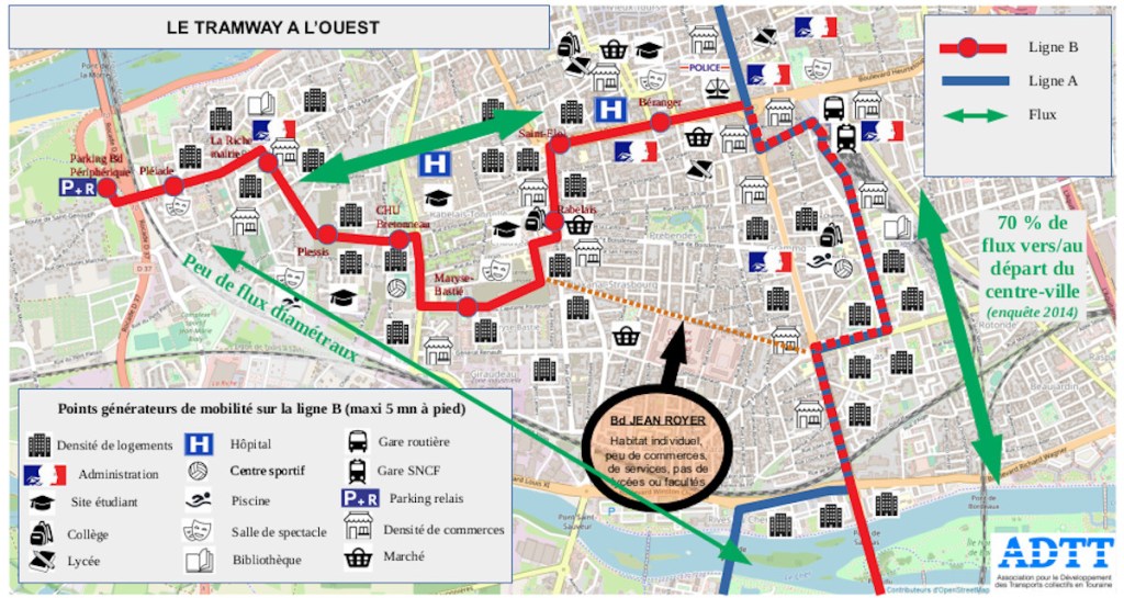 - il éviterait le centre-ville, qui est pourtant le départ ou la destination de 70 % des déplacements en transports en commun, contraignant la majorité des usagers à un changement supplémentaire, et réduisant fortement l’intérêt du parking-relais de La Riche ;