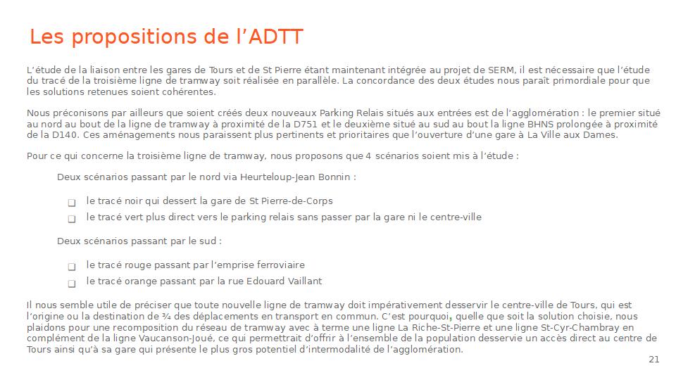Dans le dossier ci-dessous, nous avons mis à jour les solutions qui nous semblent les meilleures pour le développement des transports en commun entre Tours et Saint-Pierre-des-Corps, que ce soit pour e tramway, la navette ferroviaire ou le BHNS. Ces propositions ont été envoyées aux autorités locales.