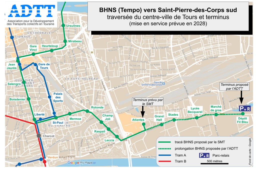 Il est regrettable que le BHNS termine sa course au Centre Commercial des Atlantes, et ceci achève de montrer que le nouveau tracé sud du BHNS a été réalisé sans grande réflexion. Ce terminus est en effet situé à l’entrée de la commune de Saint-Pierre-des-Corps, et ne concernera ni les résidents de cette commune, ni la desserte de la gare par le sud, ni les jeunes usagers des nombreux stades sportifs, du collège Corneille et du lycée Besquerel. De plus, il n’est pas tenu compte du fait que l’avenue Jacques Duclos est une des portes d’entrée de la métropole qui compte le plus grand nombre de véhicules routiers. Nous demandons à ce qu’une prolongation de ce tracé soit rapidement étudiée, en voie réservée, qui emprunterait l’avenue Jacques Duclos, puis terminerait sa course en limite de Saint-Pierre-des-Corps et de la Ville aux Dames, où un parking-relais inciterait les automobilistes à laisser leur véhicule. Cette solution permettrait de desservir une zone industrielle et commerciale importante, donc de nombreux emplois, un lycée professionnel et un collège et de nombreux sites sportifs fréquentés par les jeunes et très éloignés des zones d’habitation -les jeunes, dont on sait qu’ils sont les premiers usagers des transports collectifs-. Un tel tracé, central dans une zone en longueur, permettrait à tous les usagers fréquentant cette zone d’activités d’être à moins de 5 minutes à pied d’un arrêt.