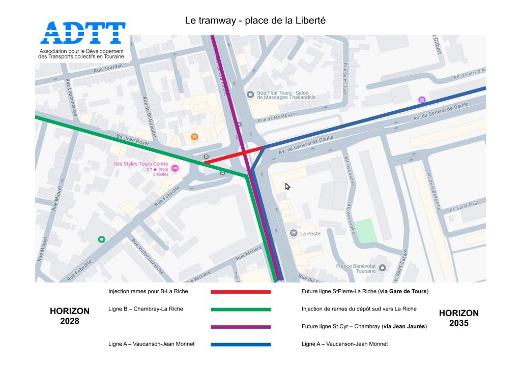 Sachant qu’un aiguillage triangulaire est prévu sur la place de la Liberté, pour injecter des rames dans le branche ouest de la ligne en début de service, il nous semble nécessaire de ne pas le limiter à cette fin, et de prévoir dès maintenant la possibilité d’exploiter d’éventuels services entre La Riche et Vaucanson.