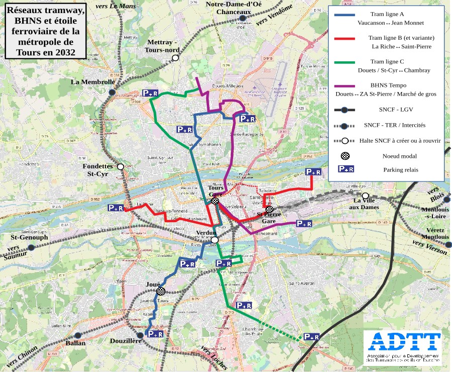 - Nous demandons que les études pour la 3e ligne, lancées en 2018, soient reprises sans attendre et menées à leur terme pour la création d’une branche à Saint-Pierre-des-Corps (voir dossier complet de l’ADTT avec les différents tracés possibles [https://adttouraine.com]), et une branche à Saint-Cyr-sur-Loire et jusqu’au quartier Douets – Choiseul à Tours nord.